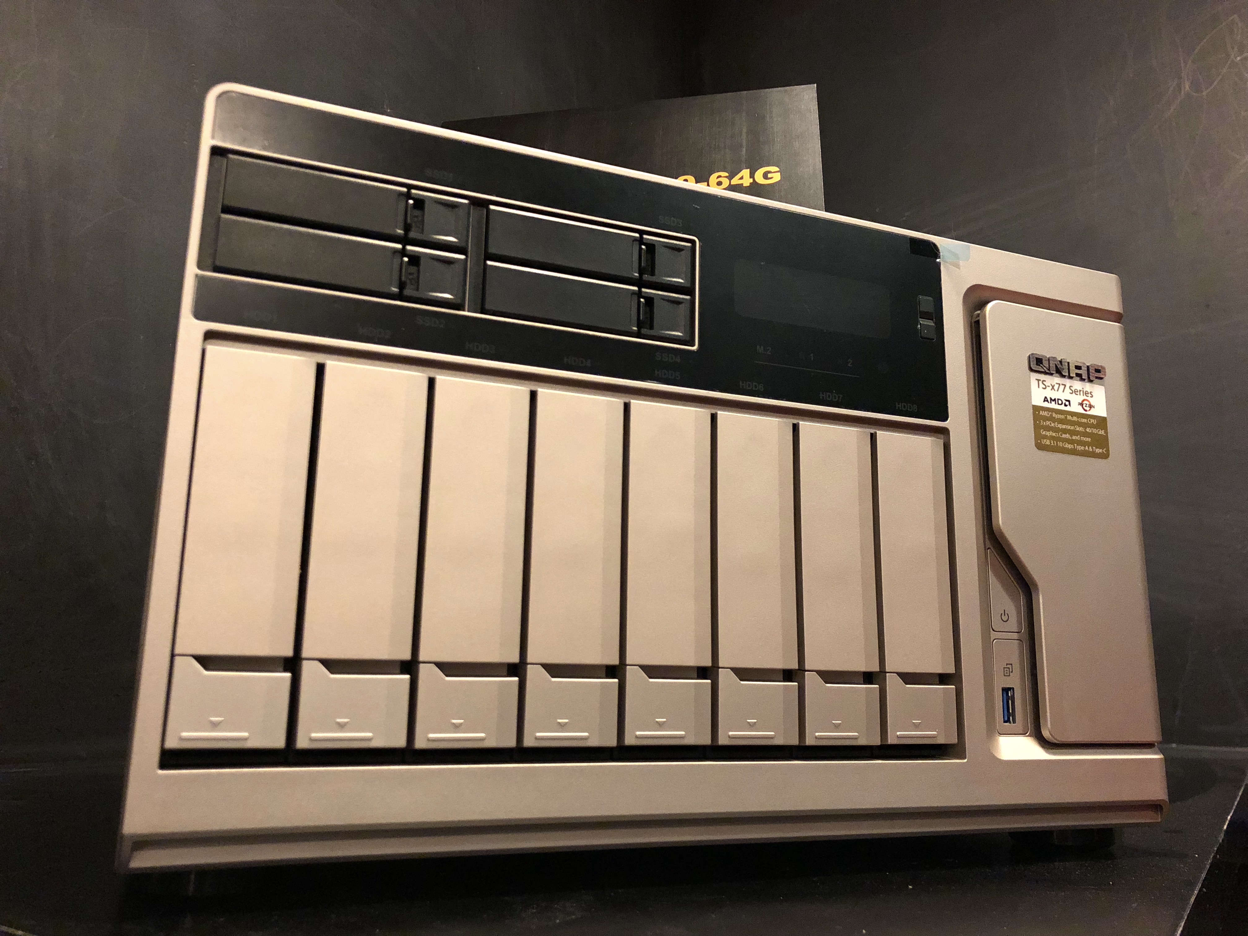 En el QNAP Media Event 2018 también pudimos ver en directo la joya de la corona de QNAP, el TS-1277. Un servidor NAS de gama alta perteneciente a la serie TS-x77 (6,8,12 bahías) que incorpora un procesador AMD Ryzen 7 1700 de 8 núcleos a 3.0 GHz para ofrecernos una increíble potencia de procesamiento en aplicaciones que demandan muchos recursos, como VDI, virtualización de servidor, nube privada y reproducción/transcodificación de video 4K.