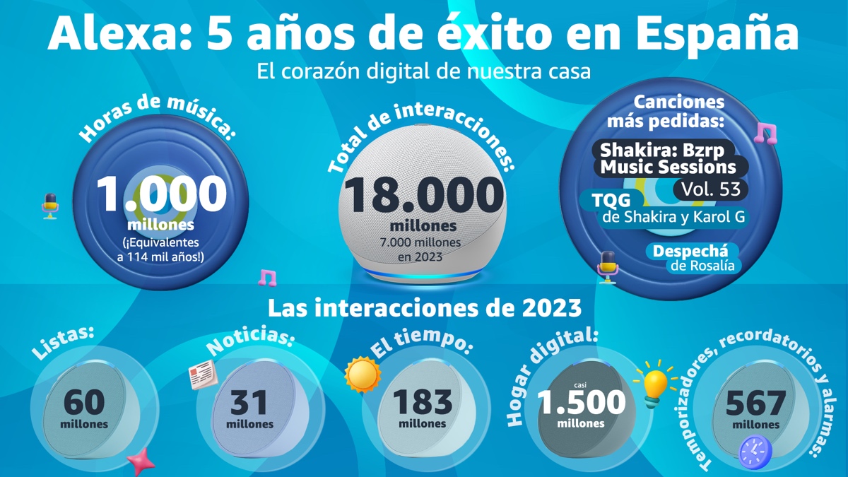 Este mes de noviembre Alexa cumple 5 años en España y han pasado 9 desde su nacimiento en Estados Unidos. En este tiempo, Alexa ha acompañado a los usuarios en diversas facetas de sus vidas, ayudando a mantener sus hogares más organizados, conectados y entretenidos, lo que ha desembocado en más de 18.000 millones de interacciones de clientes en España con el servicio de voz de Amazon.