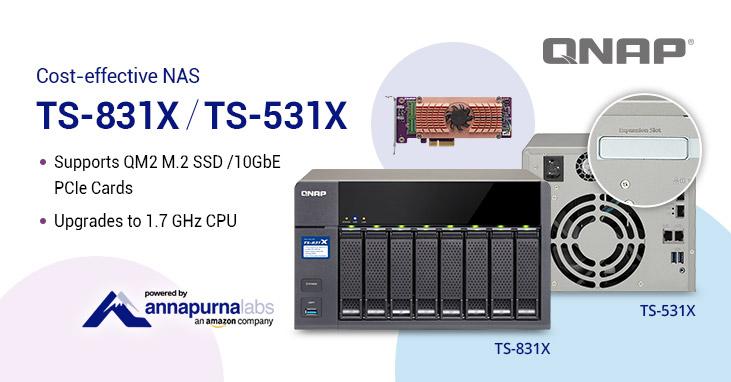 Al instalar una tarjeta QM2, los usuarios pueden configurar fácilmente los SSD M.2 para que el NAS disfrute de un rendimiento potenciado con almacenamiento en caché SSD o un pool de almacenamiento en caché, o añadir conectividad 10GbE 10GBASE-T adicional. Tanto el TS-831X como el TS-531X ahora también incluyen un procesador Alpine AL-314 quad-core 1.7 GHz de AnnapurnaLabs, una empresa Amazon, que ofrece un mayor rendimiento.
