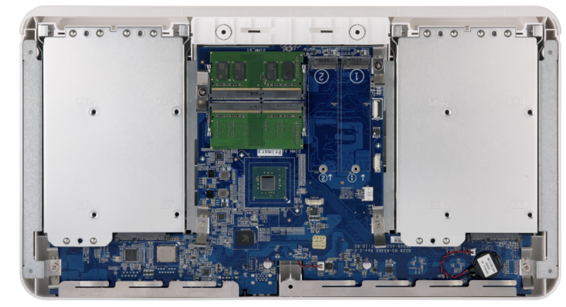 Con dos ranuras para SSD M.2 2280 SATA (unidades SSD M.2 de venta por separado) el HS-453DX también ofrece una estructura de almacenamiento híbrida con unidades de disco duro tradicionales que refuerzan el almacenamiento en caché del SSD, lo que ayuda a optimizar el rendimiento de aplicaciones exigentes (incluidas aplicaciones de transmisión multimedia como Roon Server).