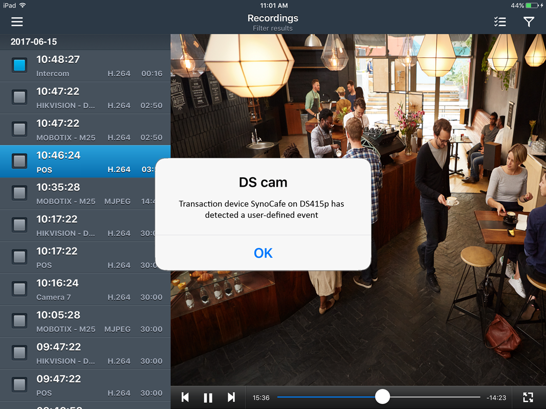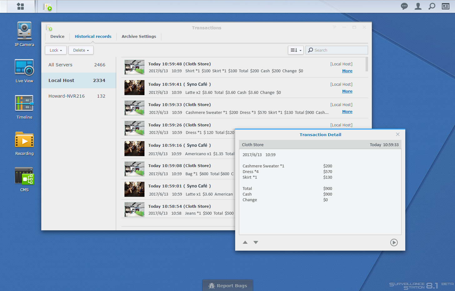 • Integración con terminales del punto de venta1: Ahora los responsables de los comercios pueden revisar cada transacción mediante el uso de los vídeos correspondientes y resolver rápidamente cualquier disputa. La nueva versión de Surveillance Station 8.1 permite buscar registros en el histórico de grabaciones a través de una interfaz intuitiva. Los usuarios también pueden optar por recibir notificaciones cuando se realicen transacciones anormales o personalizar sus notificaciones con la aplicación Regla de acción.