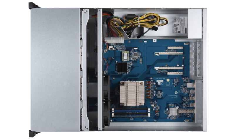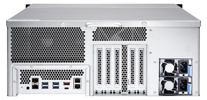 Hay cuatro ranuras PCI Express (PCIe) disponibles que permiten a los usuarios expandir la funcionalidad del NAS con adaptadores de red (40GbE, 10GBASE-T/NBASE-T™), tarjetas USB 3.1 de 2.ª generación (10 Gbps), tarjetas SSD M.2 y tarjetas gráficas. El TS-2477XU-RP incluye una unidad de alimentación eléctrica de 800 W (PSU) para admitir una tarjeta gráfica que requiere potencia adicional.