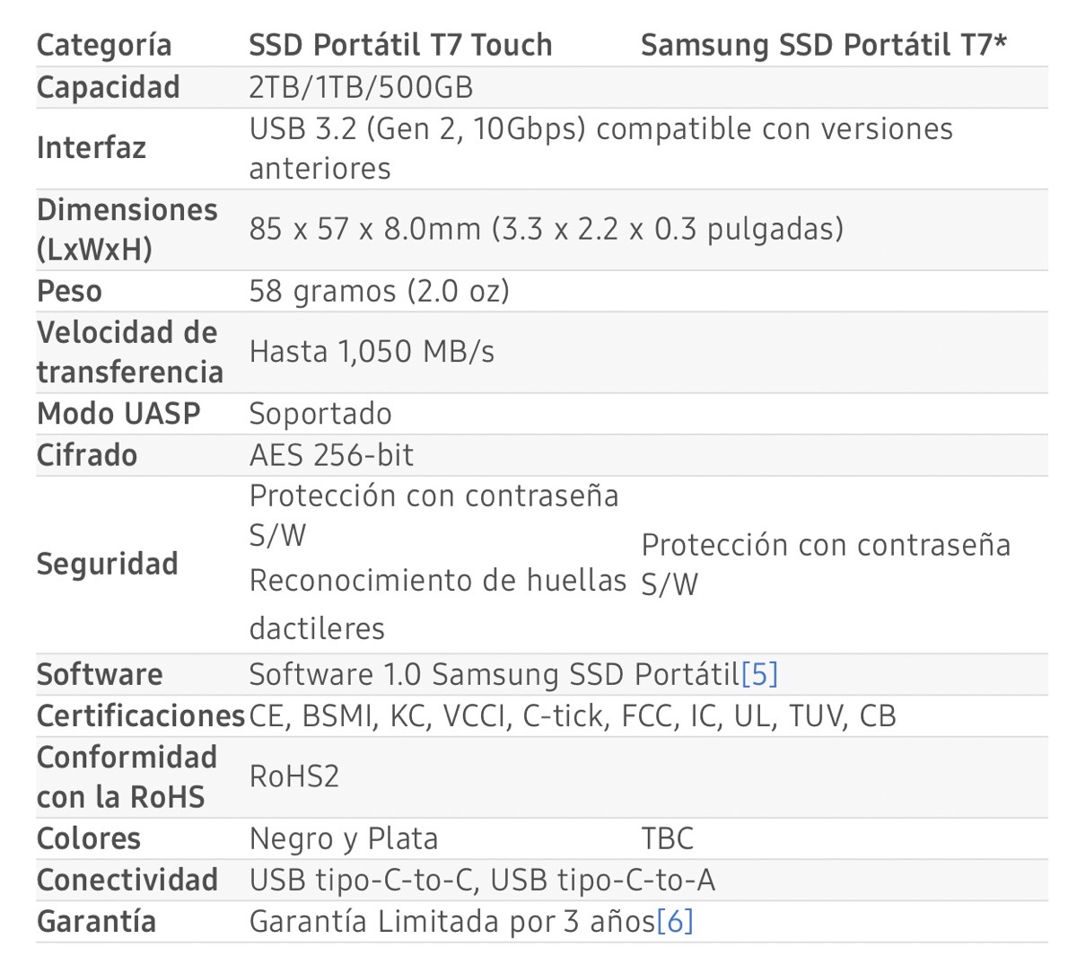 Especificaciones de SSD Portátil T7 Touch y T7