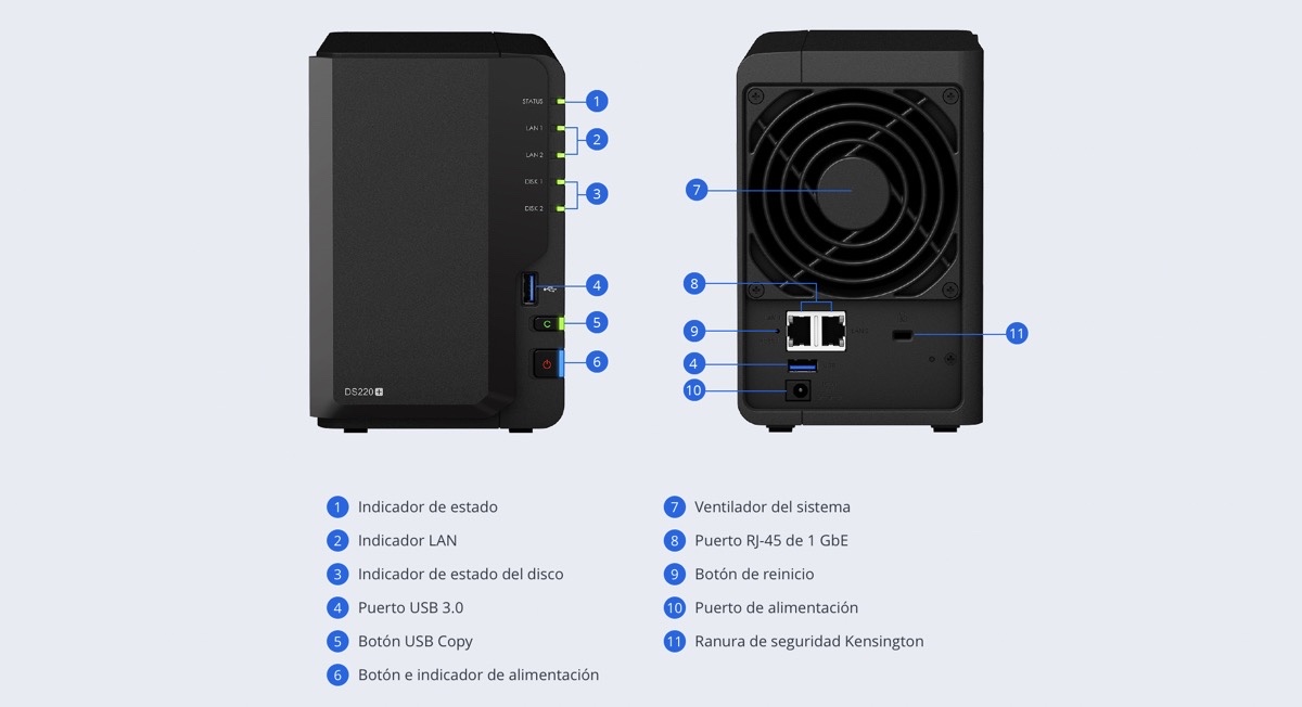 El DS220+ se ejecuta con DiskStation Manager, el avanzado e intuitivo sistema operativo para dispositivos Synology NAS que permite mejorar la productividad en el trabajo mediante sus múltiples aplicaciones. Synology ha recibido numerosos reconocimientos, incluido el primer puesto en la categoría de NAS de gama media en la encuesta de soluciones de almacenamiento realizada por TechTarget, y el premio Readers Choice de la revista PC Mag durante nueve años consecutivos.