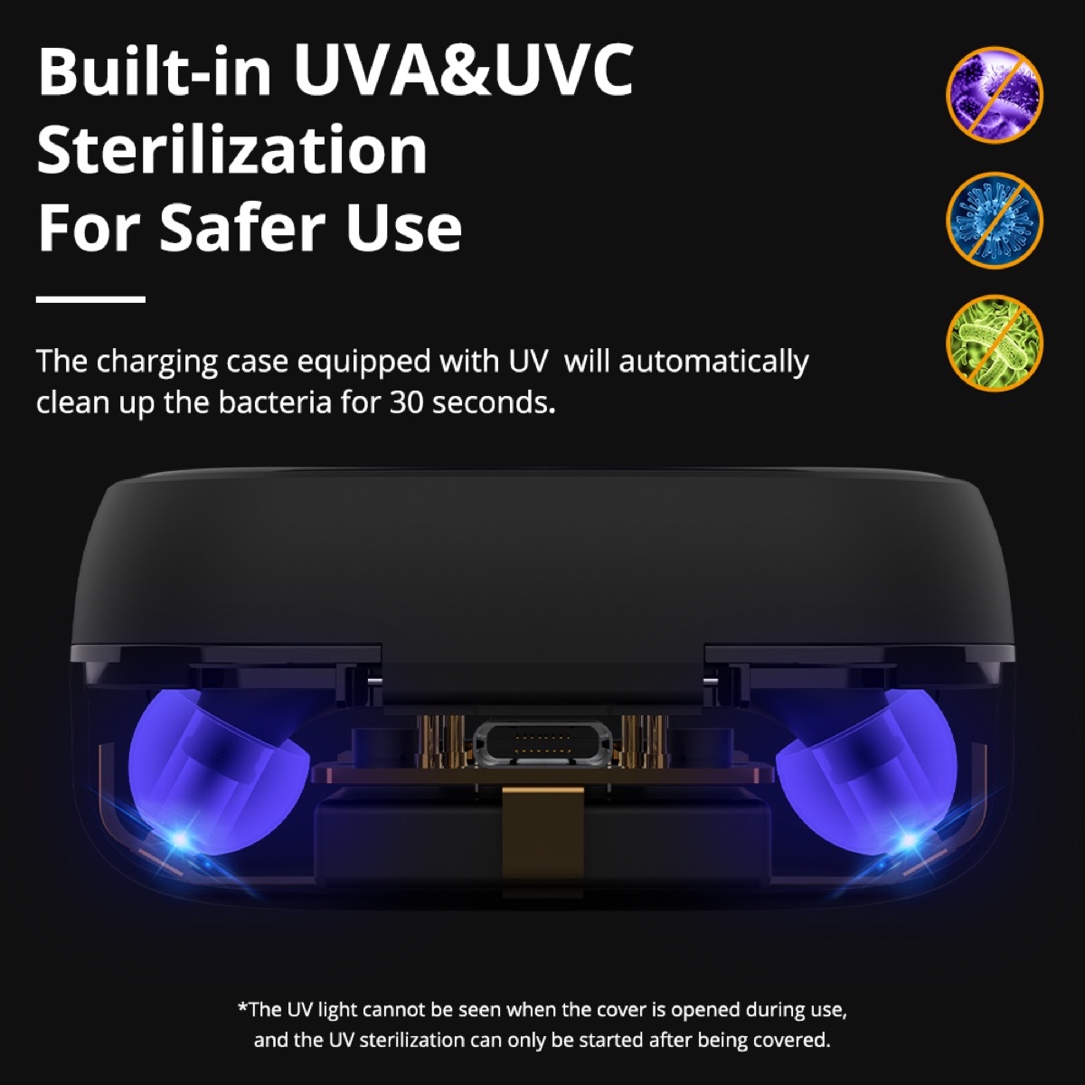 Equipados con sistema de esterilización UV, los Tronsmart Onyx Free proporcionan un uso más limpio y seguro. Simplemente colocamos los auriculares en el estuche de carga y el sistema UV esterilizará automáticamente las bacterias durante 60 segundos. Nos permite así tener una experiencia más segura que nunca.