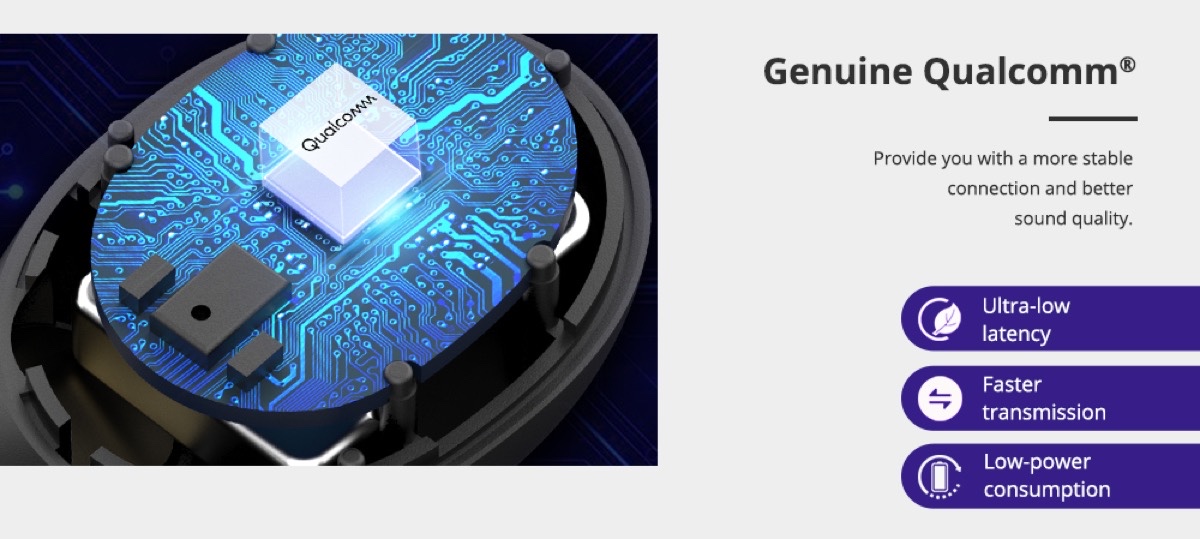 Diseñado con chip de Qualcomm®, obtendremos una conexión más estable y una calidad de sonido mucho mejor con una transmisión más rápida, latencia más baja y menor consumo de energía.