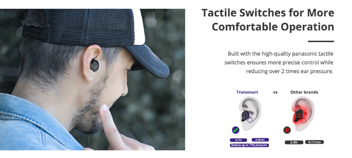 Equipado con botones táctiles Panasonic, Tronsmart Onyx Free nos brindan un control más preciso y más cómodo, con un 71% menos de presión auditiva en comparación con auriculares de botón normales.