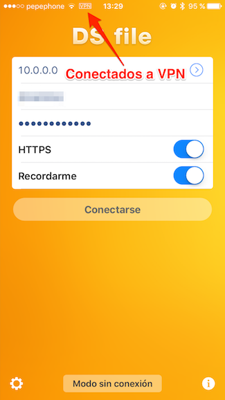 - El último paso es configurar las aplicaciones móviles de Synology para que accedan por VPN a la dirección IP que hemos establecido en el NAS en la primera parte de este artículo. Como ejemplo, he decidido usar DS file pero se puede usar cualquiera de sus «hermanas». Si vemos en la siguiente imagen, hemos indicado la dirección IP 10.0.0.0 que apunta directamente al NAS y el resto lo dejamos igual que hacemos siempre. Si todo está correcto, veremos los ficheros de nuestro NAS como siempre lo hemos hecho (transparente para nosotros).